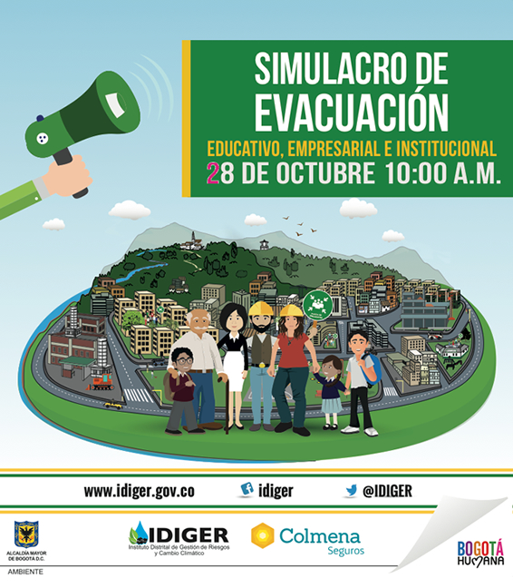 Recuerda que el próximo 28 de octubre a las 10:00 AM todos tenemos que evacuar en Bogotá, así contribuimos con el plan de emergencias de la ciudad, desarrollamos la capacidad de estar preparado para una contingencia y sabremos como actuar ante una situación de riesgo.